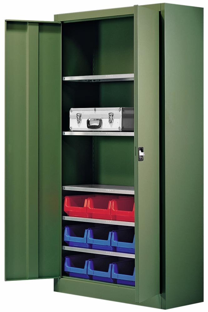 Flügeltürenschrank, BxTxH 950x420x1950 mm, RAL 6011 resedagrün, Fachlast 80 kg, mit Kästen: 8xGr. 3 rot, 8xGr. 3 blau, 12xGr. 3 gelb E861389