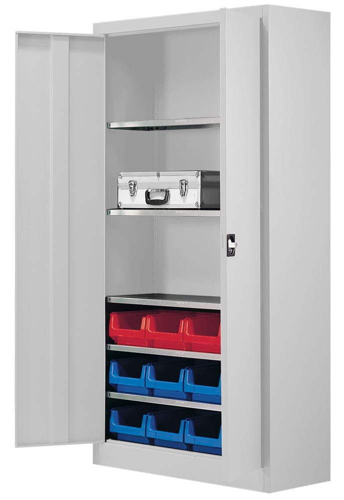 Flügeltürenschrank, BxTxH 950x420x1950 mm, RAL 7035 lichtgrau, Fachlast 80 kg, mit Kästen: 8xGr. 3 rot, 8xGr. 3 blau, 12xGr. 3 gelb E861390