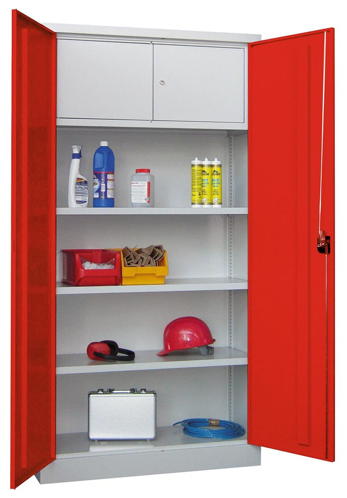 · Stabile Stahlblechkonstruktion, Böden fest verschweißt · Oberfläche pulverbeschichtet · Schränke mit gemeinsam verschließbaren Türen und Verstärkungstaschen ∙ Verriegelung mit Zylinderschloss inkl. 2 Schlüsseln ∙ Glatter, ausfegbarer Boden