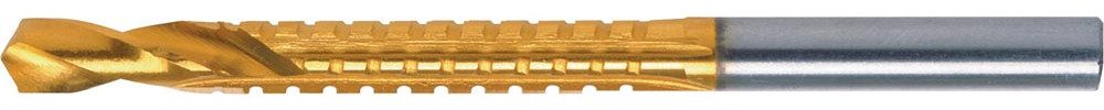 HSS · TiN-beschichtet · Spitzenwinkel 118 ° · Kegelmantelanschliff · zum Bohren und Fräsen in Blech, Holz, Kunststoff und dünnwandigen Materialien · kurzer Spiralbohrerteil, übergehend in Frässchneiden und Spanbrechern