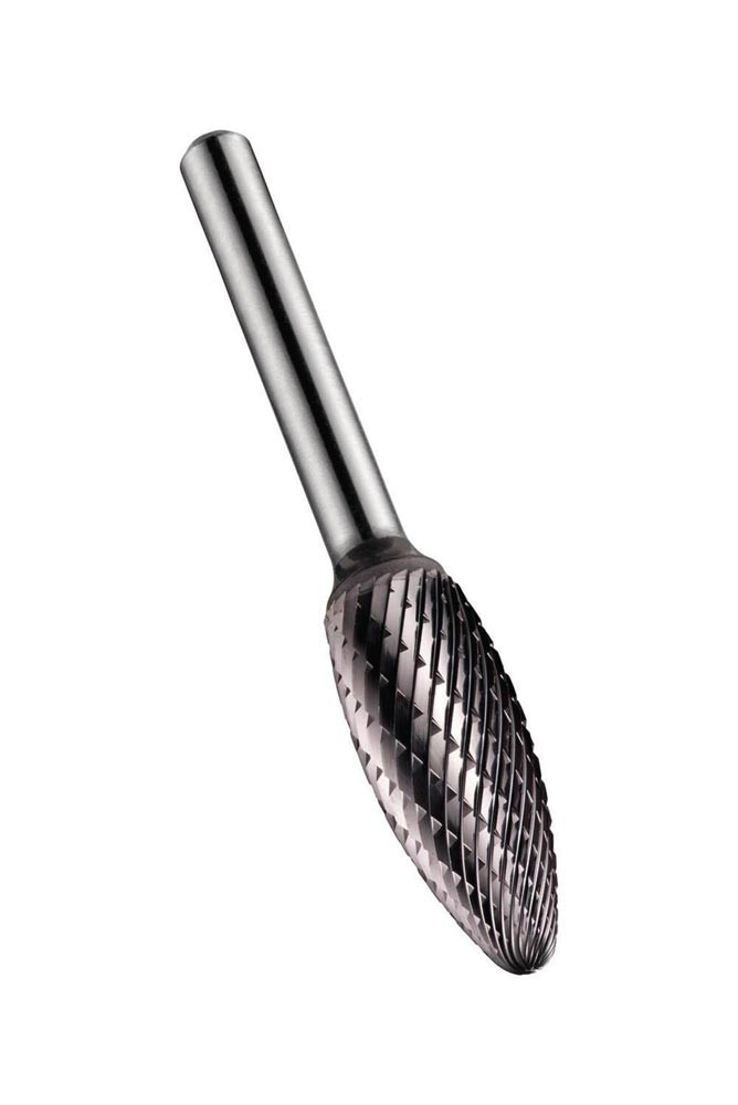 Flemmanförmiger Frässtift (Form H) · Durchmesser 8mm mit 19mm Schnittlänge · 64mm Gesamtlänge und 6mm Schaft · VHM mit gehärtetem Stahlschaft und TiAlN Beschichtung · DC doppelseitigem Schnitt mit enger Zahnteilung zur Rundkantenkonturierung und Schweißvorbereitung in Stahl und Stahlguss · Edelstahl · Gusseisen · Kupfer oder Kupferlegierungen · Hochwarmfeste Legierungen · gehärtete Materialien