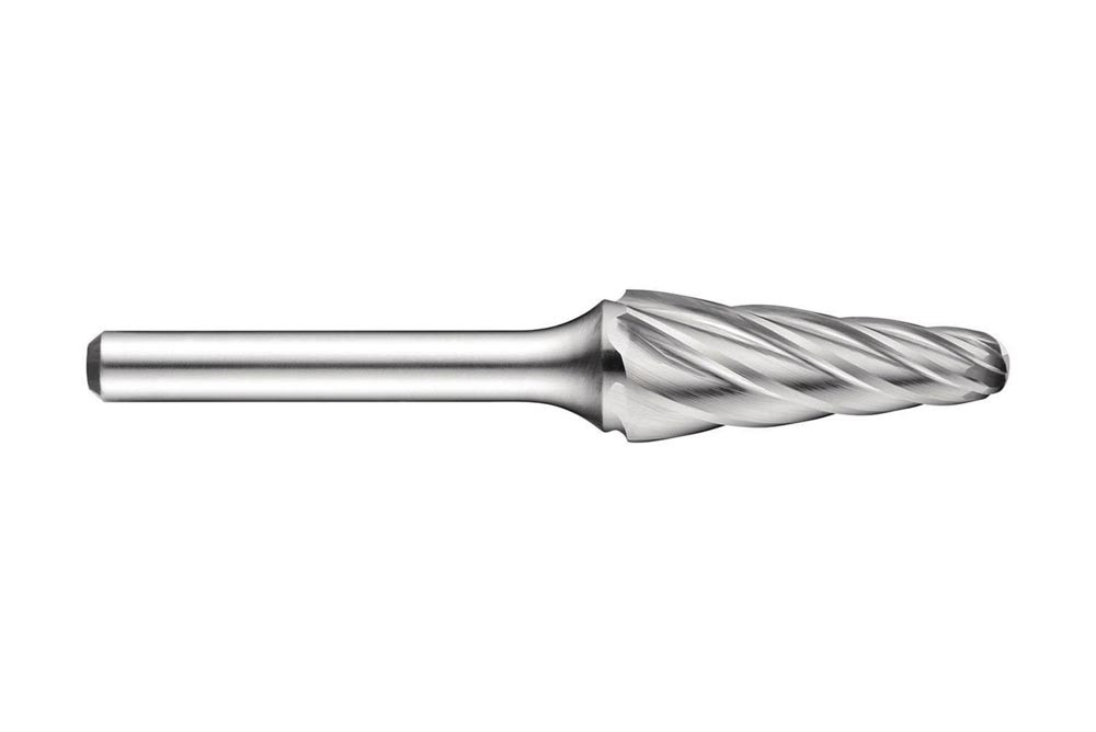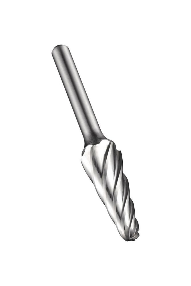 Kugelkegel-Frässtift (Form L) · Durchmesser 12.7mm mit 32mm Schnittlänge · 77mm Gesamtlänge und 6mm Schaft · VHM mit gehärtetem Stahlschaft und blanker Oberfläche · AL einseitigem Schnitt mit weiter Zahnteilung zum Vergrößern von Löchern · Abrunden von Kanten und Oberflächenveredeln in engen Winkeln oder anderen schwer zugänglichen Bereichen in Reinaluminium · Aluminiumguss 0 und Polymere