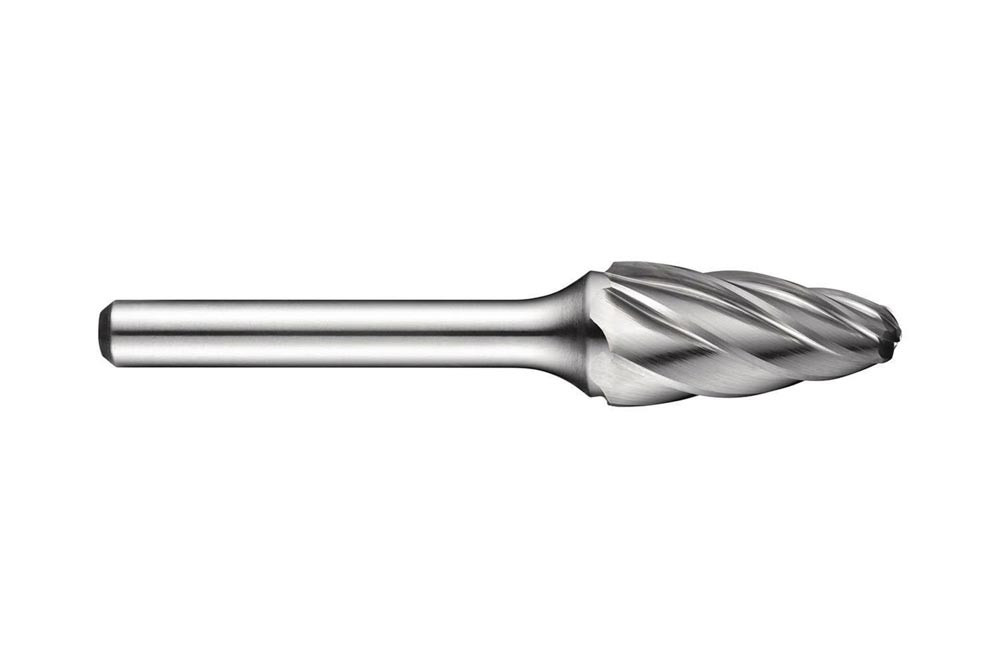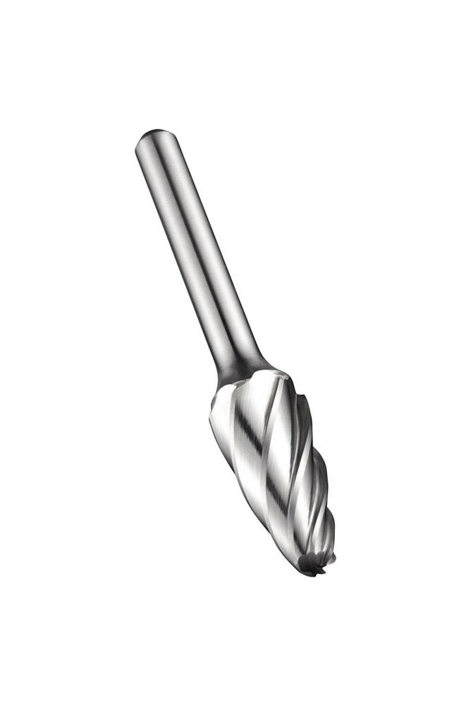 Abgerundeter Tannen-Frässtift (Form F) · Durchmesser 6mm mit 18mm Schnittlänge · 50mm Gesamtlänge und 6mm Schaft · Vollhartmetall mit blanker Oberfläche · AL einseitigem Schnitt mit weiter Zahnteilung zum bearbeiten von Konturen mit mehreren Winkeln · Abrunden von Kanten und Schneiden in schwer zugängliche Bereichen in Reinaluminium · Aluminiumguss 0 und Polymere