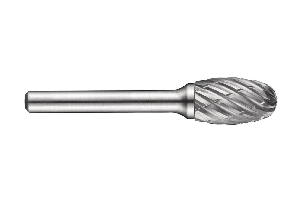 Ovaler Frässtift (Form E) · Durchmesser 12.7mm mit 22mm Schnittlänge · 67mm Gesamtlänge und 6mm Schaft · VHM mit gehärtetem Stahlschaft und blanker Oberfläche · ST einseitigem Schnitt mit Spanbrecher und mittlerer Zahnteilung zur runden Kantenformung in Stahl und Stahlguss