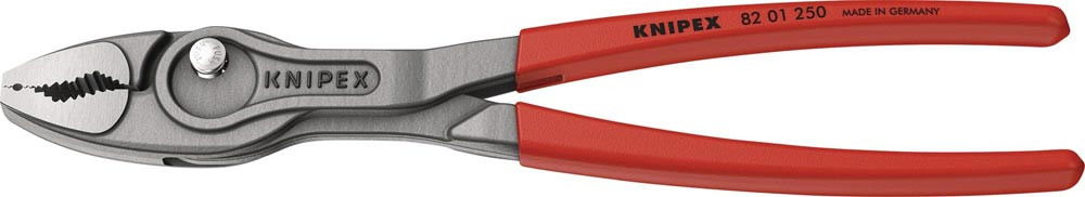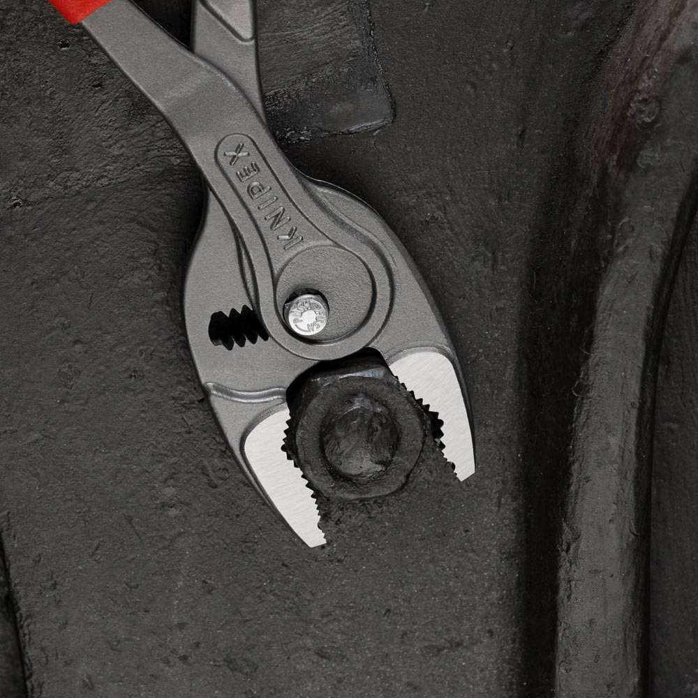 82 01 250 KNIPEX TwinGrip® Greifen · Anziehen und Lösen von Schrauben mit verschlissenen Köpfen und Antrieben. Einzigartige Kombination: Frontgreif- und Seitengreif-Funktion · durchgestecktes Gelenk · Druckknopfverstellung. Bissiges Frontgreifmaul mit robusten Zähnen und hoher Übersetzung an der Maulspitze. Sehr schlanke und kompakte Zange: filigranes Arbeiten auch in beengten Bauräumen · mit schlanker Drehzone für schnelles Schrauben. Große Front- und Seitengreif-Kapazitäten: für Durchmesser und Schlüsselweiten 5 – 27 mm. Zuverlässiges · frontales Greifen flacher Werkstücke bis 10 mm durch Dreipunkt-Anlage. Siebenfach verstellbares Gleitgelenk mit Druckknopfverstellung für präzises Anpassen der Greifweite. Klemmschutz mindert das Risiko gequetschter Finger. Langlebig und belastbar durch robustes · durchgestecktes Zangengelenk. Greift kraftvoll auch große · sehr fest- und tiefsitzende Bauteile mit SW 5 - 27 mm. - Einstellpositionen: 7 - Kapazität für Rohre (Durchmesser): Ø 1/16 – 13/64in - Kapazität für Rohre (Durchmesser): Ø 5 – 27mm - Kapazität für Muttern · Schlüsselweite (mm): 5 – 27mm - Kapazität für Muttern · Schlüsselweite (Zoll): 13/64 – 1/16in