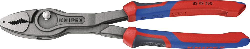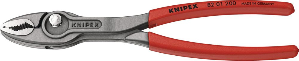 82 02 250 KNIPEX TwinGrip® Greifen · Anziehen und Lösen von Schrauben mit verschlissenen Köpfen und Antrieben. Einzigartige Kombination: Frontgreif- und Seitengreif-Funktion · durchgestecktes Gelenk · Druckknopfverstellung. Bissiges Frontgreifmaul mit robusten Zähnen und hoher Übersetzung an der Maulspitze. Sehr schlanke und kompakte Zange: filigranes Arbeiten auch in beengten Bauräumen · mit schlanker Drehzone für schnelles Schrauben. Große Front- und Seitengreif-Kapazitäten: für Durchmesser und Schlüsselweiten 5 – 27 mm. Zuverlässiges · frontales Greifen flacher Werkstücke bis 10 mm durch Dreipunkt-Anlage. Siebenfach verstellbares Gleitgelenk mit Druckknopfverstellung für präzises Anpassen der Greifweite. Klemmschutz mindert das Risiko gequetschter Finger. Langlebig und belastbar durch robustes · durchgestecktes Zangengelenk. Greift kraftvoll auch große · sehr fest- und tiefsitzende Bauteile mit SW 5 - 27 mm. Mit Comfort-Griffen: aus drei ergonomischen Komponenten für optimierte Handhabung und mit zwei KNIPEXtend-Schnittstellen für Erweiterungen. - Einstellpositionen: 7 - Kapazität für Rohre (Durchmesser): Ø 1/16 – 13/64in - Kapazität für Rohre (Durchmesser): Ø 5 – 27mm - Kapazität für Muttern · Schlüsselweite (mm): 5 – 27mm - Kapazität für Muttern · Schlüsselweite (Zoll): 13/64 – 1/16in