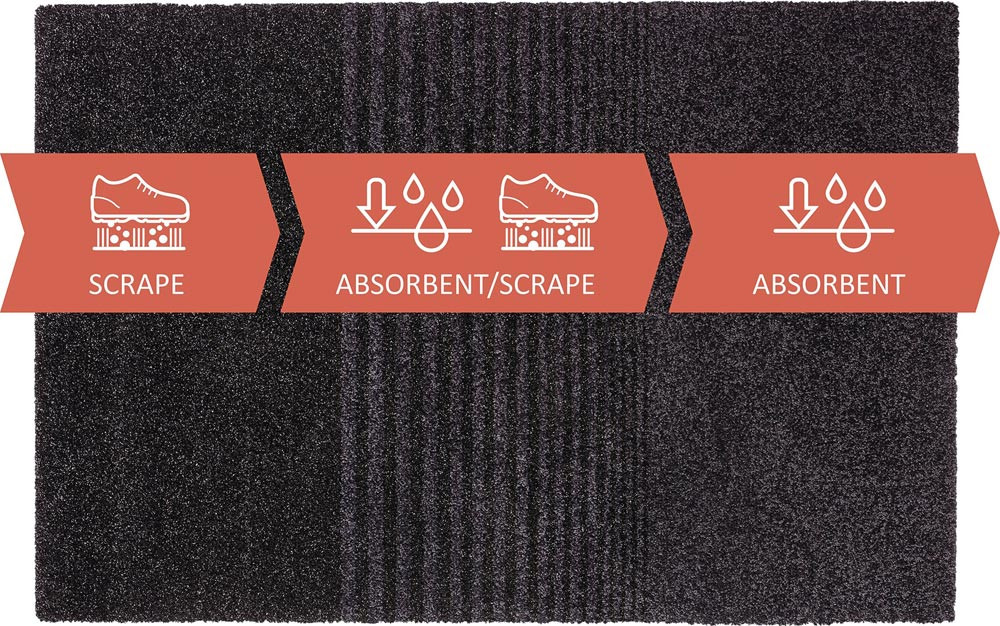 neuartige Matte mit verschiedenen Reinigungszonen · Bürstenzone zur groben Reinigung · Übergangszone · Aufnahmezone für feinen Schmutz und Feuchtigkeit · Nutzschicht 100 % PP · Rücken Vinyl · Gesamtgewicht ca. 3400 g/m² · für den Innenbereich · Stärke ca. 10 mm
