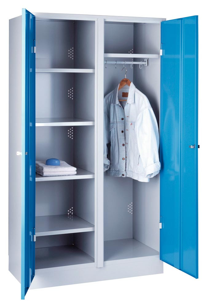 Garderoben-Wäscheschrank m. Flügeltüren u. Sockel, 2 Abt. 500 mm, 4 Böden, BxTxH 1000x500x1800 mm, Schloss, RAL 7035/5012 E1987053