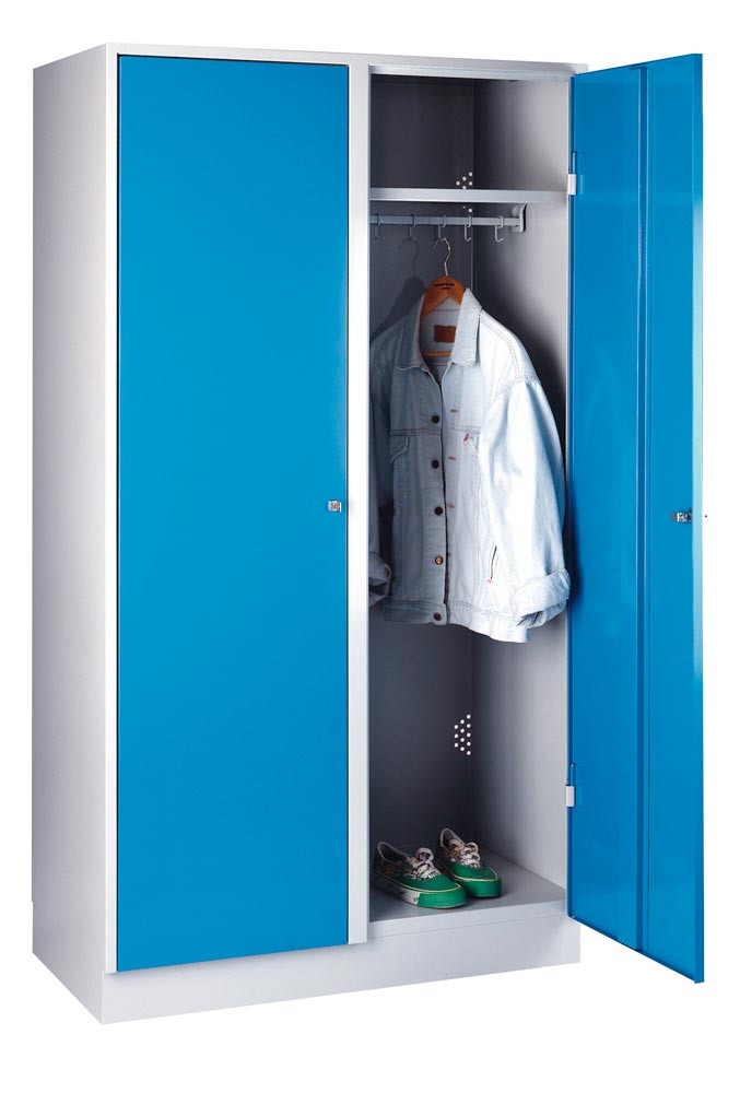 Garderoben-Wäscheschrank m. Flügeltüren u. Sockel, 2 Abt. 500 mm, BxTxH 1000x500x1800 mm, Schloss, RAL 7035/5012 E1987050