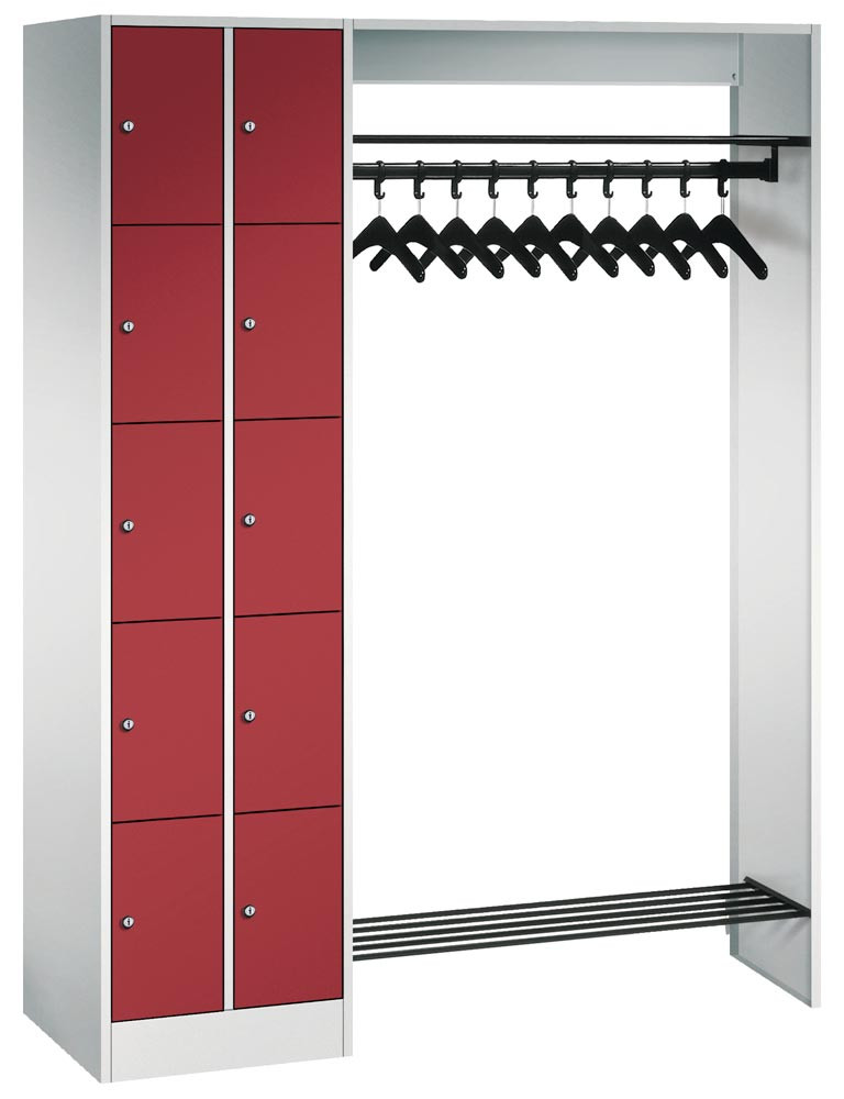 Schließfachschränke mit 5 Fächern übereinander bieten in Kombination mit funktionalen Garderobeneinheiten für 5, 10, 15 oder 20 Personen ausreichend Platz für Kleidung und persönliche Dinge.