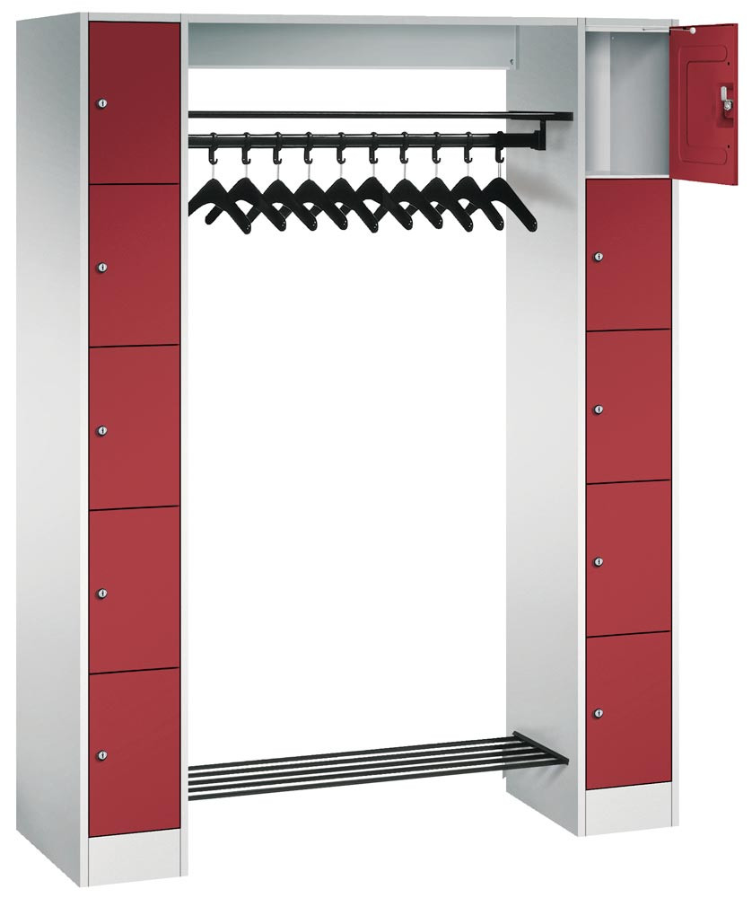 Schließfachschränke mit 5 Fächern übereinander bieten in Kombination mit funktionalen Garderobeneinheiten für 5, 10, 15 oder 20 Personen ausreichend Platz für Kleidung und persönliche Dinge.