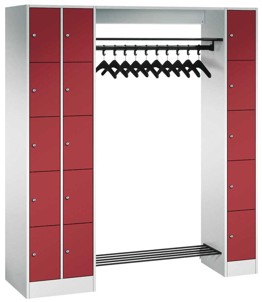 Schließfachschränke mit 5 Fächern übereinander bieten in Kombination mit funktionalen Garderobeneinheiten für 5, 10, 15 oder 20 Personen ausreichend Platz für Kleidung und persönliche Dinge.