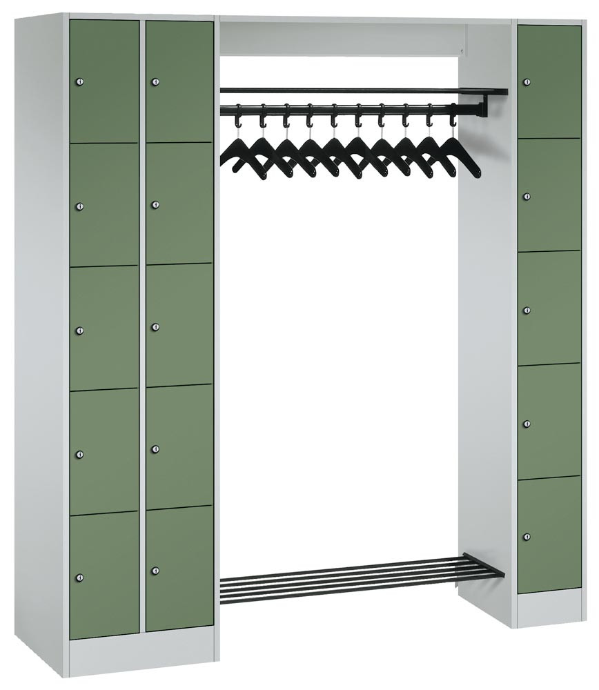 Schließfachschränke mit 5 Fächern übereinander bieten in Kombination mit funktionalen Garderobeneinheiten für 5, 10, 15 oder 20 Personen ausreichend Platz für Kleidung und persönliche Dinge.