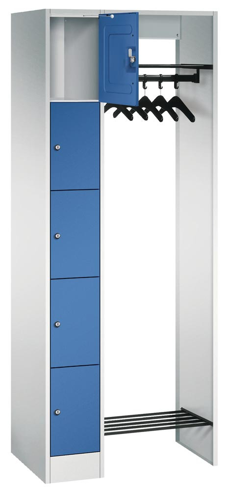 Schließfachschränke mit 5 Fächern übereinander bieten in Kombination mit funktionalen Garderobeneinheiten für 5, 10, 15 oder 20 Personen ausreichend Platz für Kleidung und persönliche Dinge.