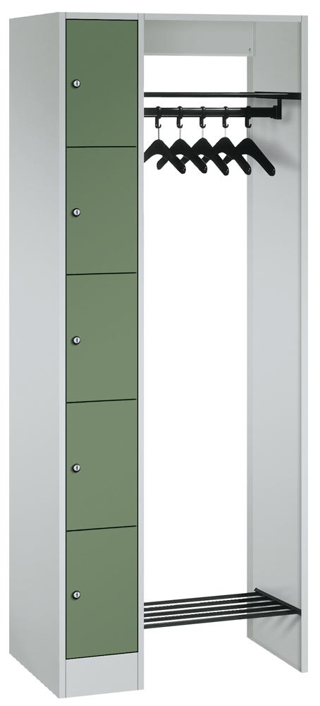 Schließfachschränke mit 5 Fächern übereinander bieten in Kombination mit funktionalen Garderobeneinheiten für 5, 10, 15 oder 20 Personen ausreichend Platz für Kleidung und persönliche Dinge.