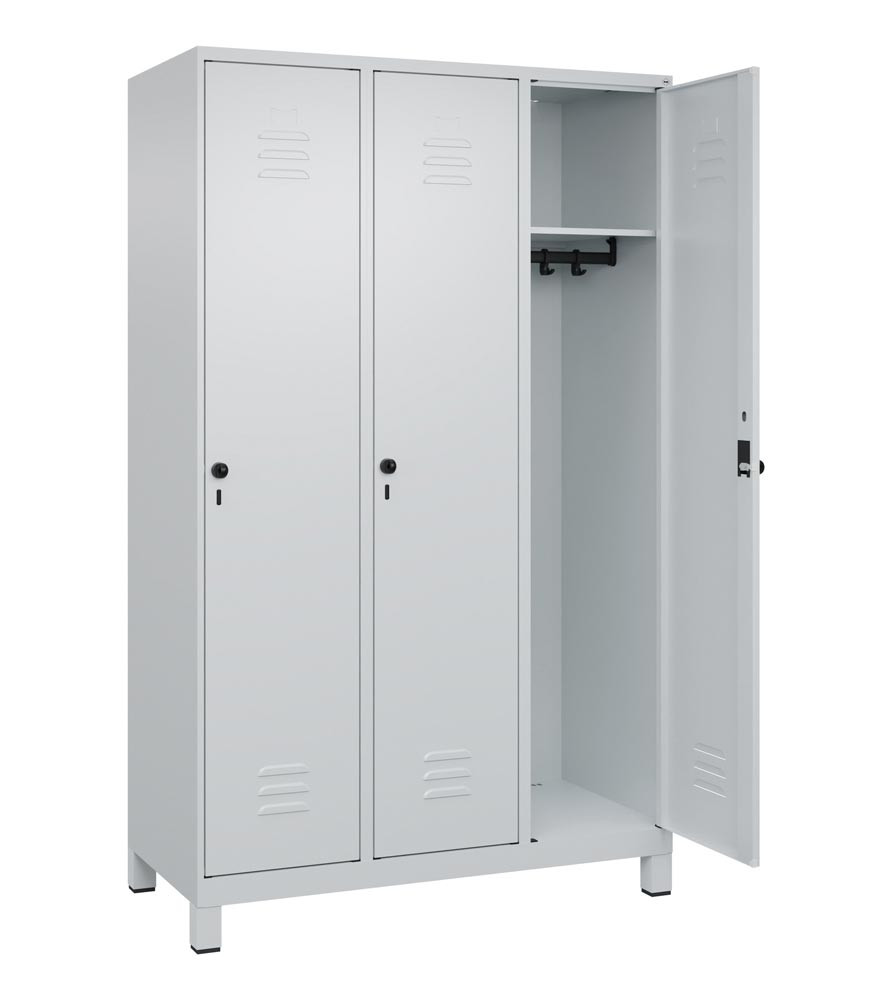 Garderobenschrank, BxTxH 1200x500x1950 mm, 3 Abteile, B 400 mm, Füße, Drehriegel, RAL 7035