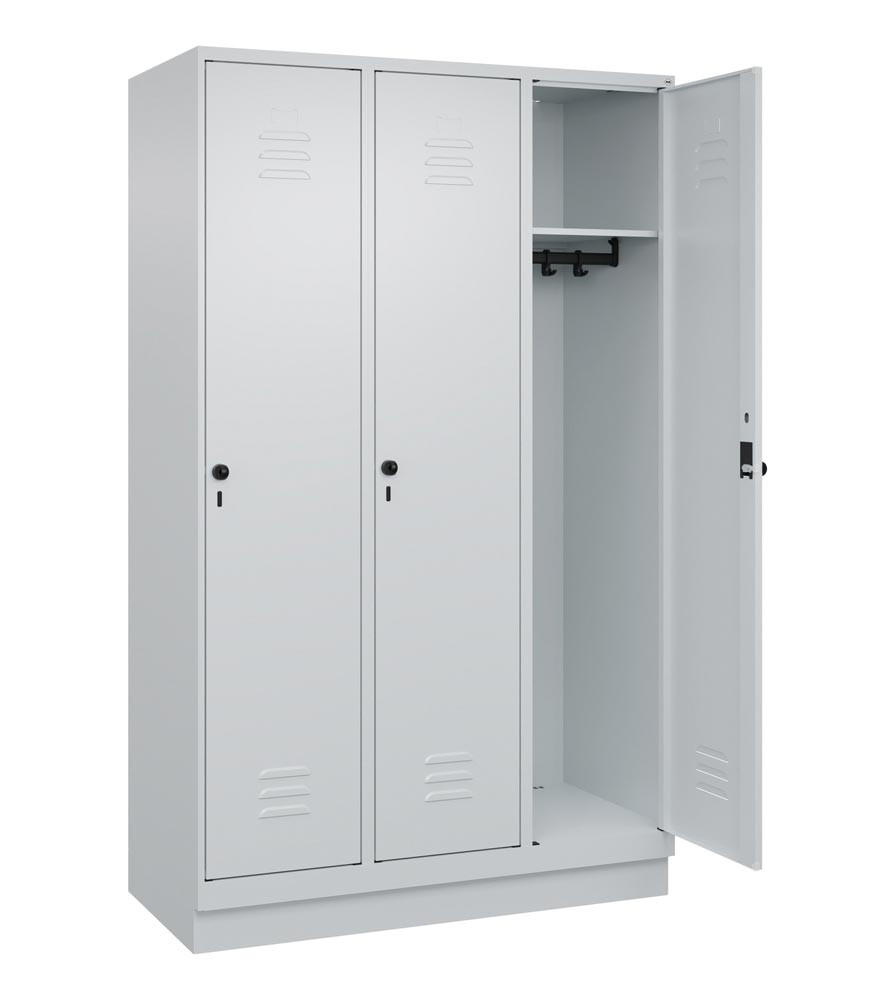 Garderobenschrank, BxTxH 1200x500x1950 mm, 3 Abteile, B 400 mm, Sockel, Drehriegel, RAL 7035