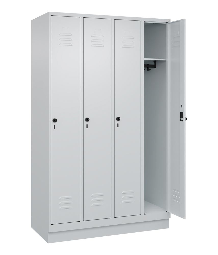 Garderobenschrank, BxTxH 1200x500x1950 mm, 4 Abteile, B 300 mm, Sockel, Drehriegel, RAL 7035
