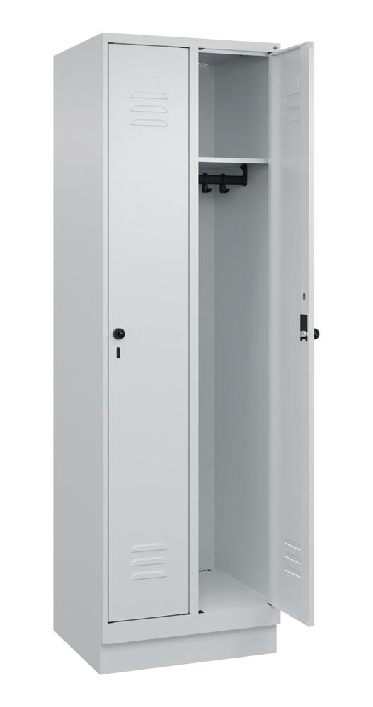 Garderobenschrank, BxTxH 600x500x1950 mm, 2 Abteile, B 300 mm, Sockel, Drehriegel, RAL 7035