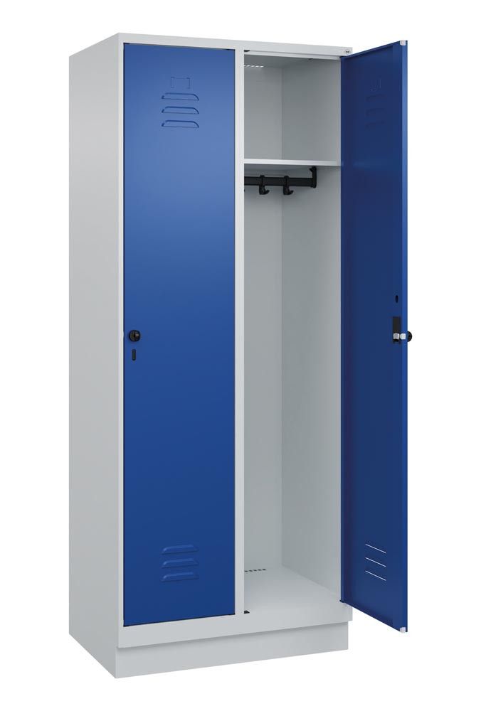 Garderobenschrank, BxTxH 800x500x1950 mm, 2 Abteile, B 400 mm, Sockel, Drehriegel, RAL 7035/5010