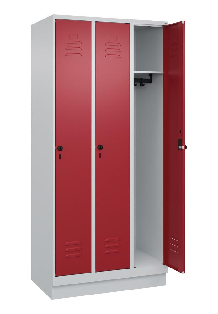 Garderobenschrank, BxTxH 900x500x1950 mm, 3 Abteile, B 300 mm, Sockel, Drehriegel, Farbwahl