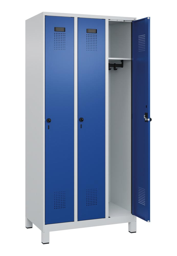 Garderobenschrank, Füße, 3 Abteile, Abt.B 300 mm, Drehriegel, BxTxH 900x500x1950 mm, RAL 7035/5010