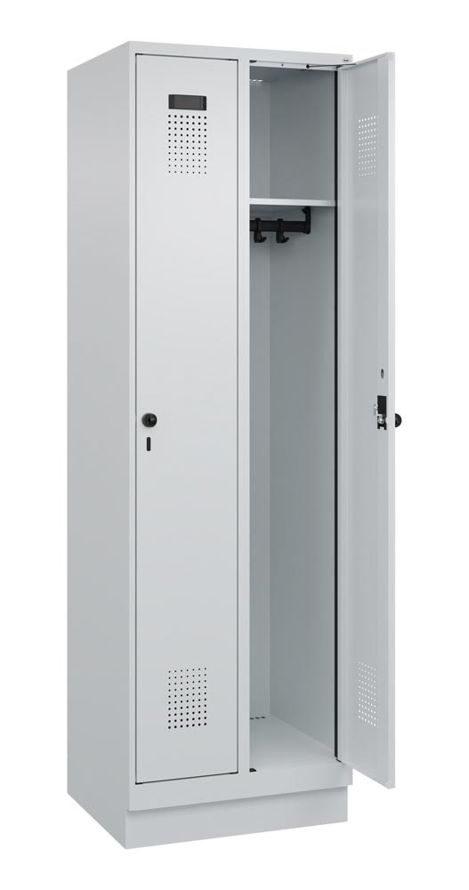 Garderobenschrank, Sockel, 2 Abteile, Abt.B 300 mm, Drehriegel, BxTxH 600x500x1950 mm, RAL 7035