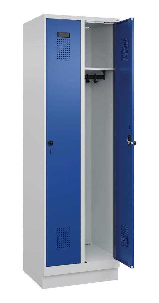 Garderobenschrank, Sockel, 2 Abteile, Abt.B 300 mm, Drehriegel, BxTxH 600x500x1950 mm, RAL 7035/5010