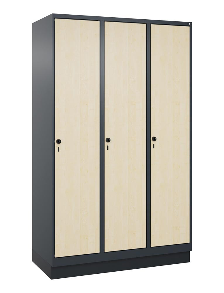 Garderobenschrank, Sockel, 3 Abt., Abt.B 400 mm, BxTxH 1200x500x1950 mm, HPL-Dekorfront, RAL 7016/Dekor Ahorn
