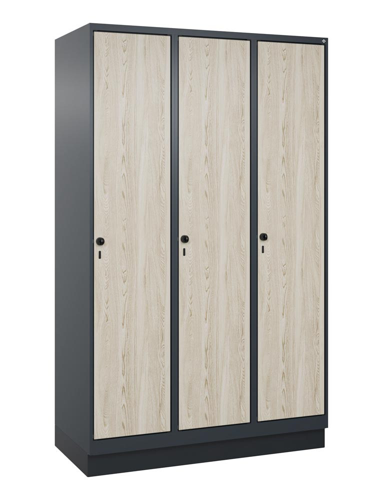 Garderobenschrank, Sockel, 3 Abt., Abt.B 400 mm, BxTxH 1200x500x1950 mm, HPL-Dekorfront, RAL 7016/Dekor Sen-Esche