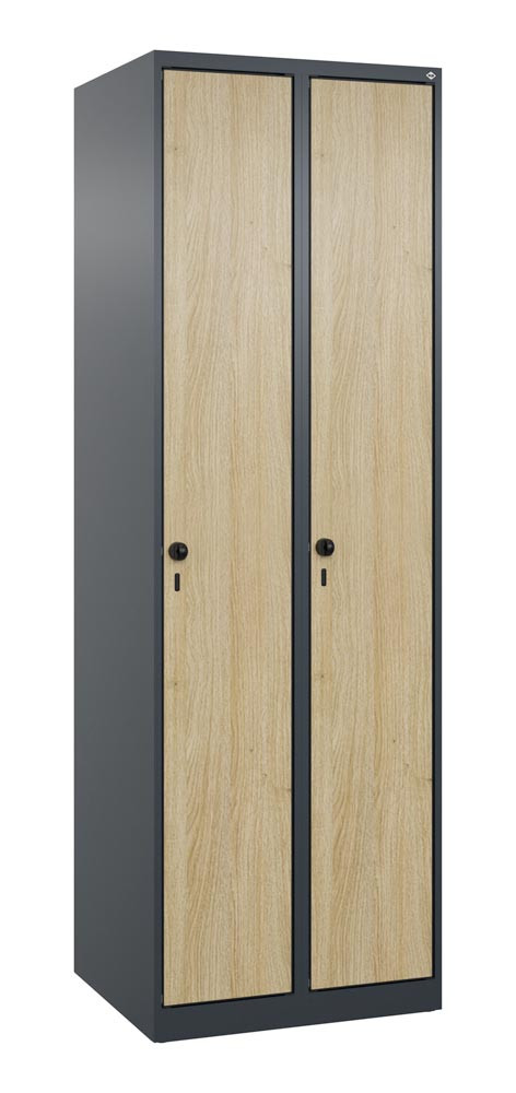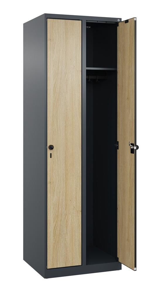 Garderobenschrank, bodenstehend, 2 Abt., Abt.B 300 mm, BxTxH 600x500x1850 mm, HPL-Dekorfront, RAL 7016/Dekor Eiche-Sereno