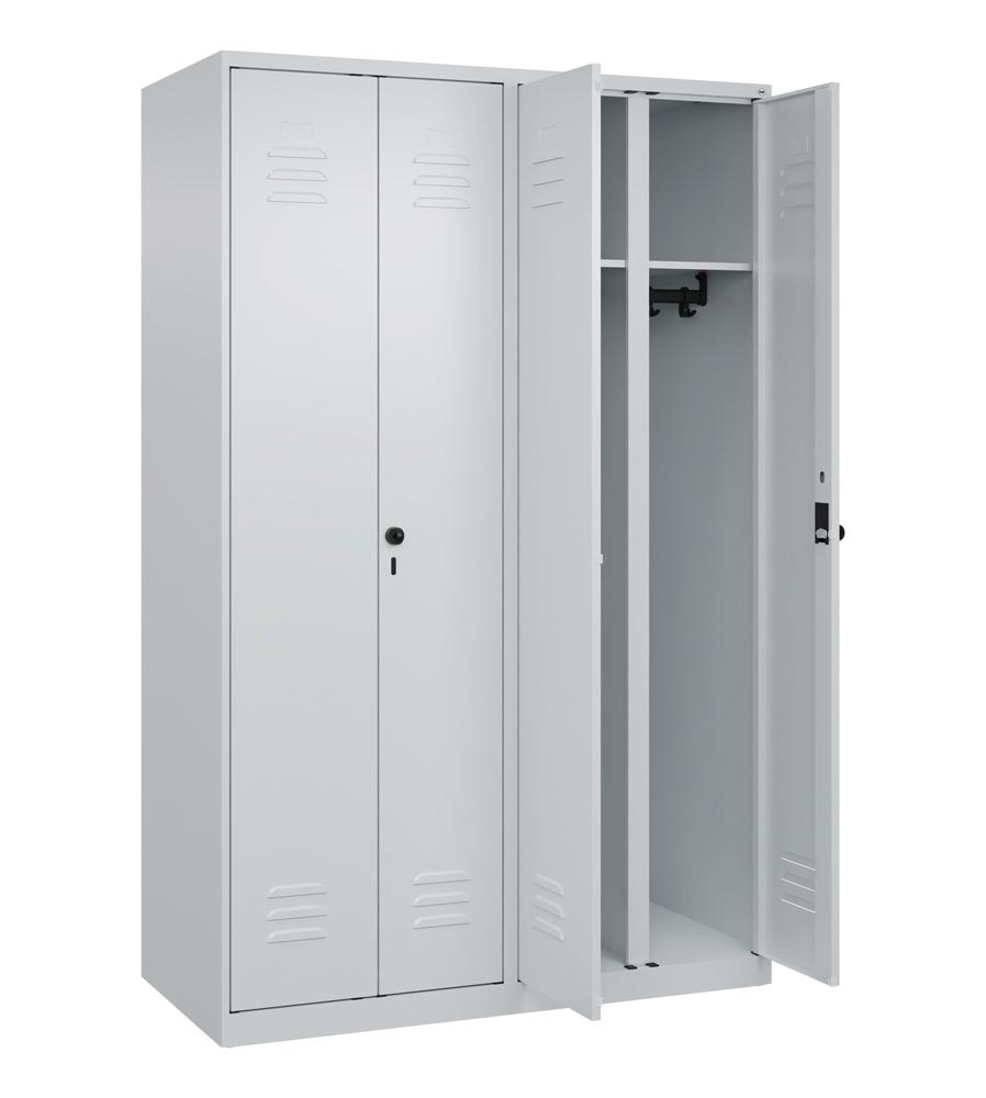 · Stabile Stahlkonstruktion mit hochwertiger Einbrennbeschichtung · Schmale Seitenkanten für verbesserte Optik bei Reihenstellung · Türen verstärkt, mit Anschlagdämpfer und Lüftungskiemen · Sicherheits-Drehriegelverschluss (serienmäßig) für Vorhangschloss (als Zubehör erhältlich) · Schrank aufbruchgeschützt gem. Klasse B DIN 4547-2 · Abteilboden glatt auskehrbar · Verdrehsichere Doppel-Schiebehaken · Mit paarweise zueinanderschlagenden Türen und gemeinsamem Verschluss, 2 Abteile = 1 Person · Zur professionellen "Schwarz-/Weiß-Trennung" von Berufs- und Privatkleidung gem. Arbeitsstättenrichtlinie