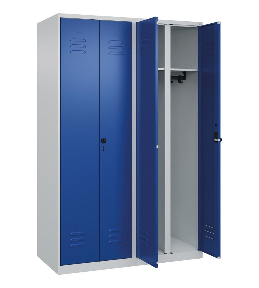 · Stabile Stahlkonstruktion mit hochwertiger Einbrennbeschichtung · Schmale Seitenkanten für verbesserte Optik bei Reihenstellung · Türen verstärkt, mit Anschlagdämpfer und Lüftungskiemen · Sicherheits-Drehriegelverschluss (serienmäßig) für Vorhangschloss (als Zubehör erhältlich) · Schrank aufbruchgeschützt gem. Klasse B DIN 4547-2 · Abteilboden glatt auskehrbar · Verdrehsichere Doppel-Schiebehaken · Mit paarweise zueinanderschlagenden Türen und gemeinsamem Verschluss, 2 Abteile = 1 Person · Zur professionellen "Schwarz-/Weiß-Trennung" von Berufs- und Privatkleidung gem. Arbeitsstättenrichtlinie