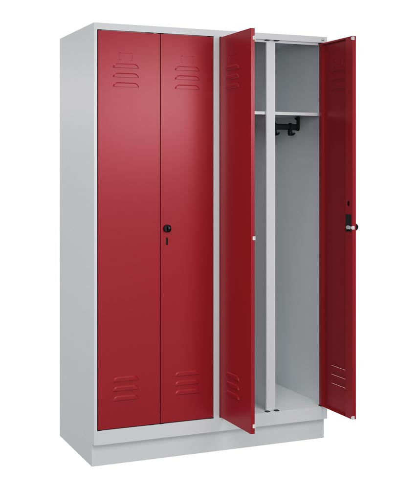 Garderobenschrank, paarw. zuein. schlagende Türen, BxTxH 1200x500x1950 mm, 4 Abteile, Abt.B 300 mm, Sockel, Drehriegel, Farbwahl