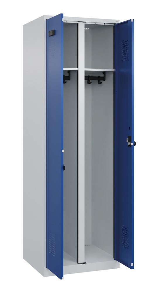 Garderobenschrank, paarw. zuein. schlagende Türen, BxTxH 600x500x1850 mm, 2 Abteile, 1 Nutzer, Abt.B 300 mm, bodenstehend, Drehriegel, Farbbwahl E6479073