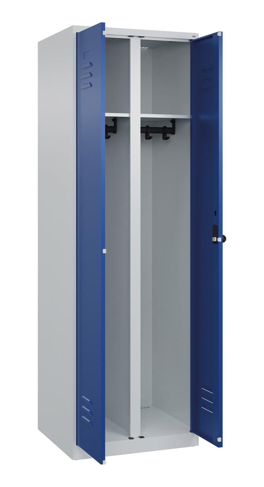 Garderobenschrank, paarw. zuein. schlagende Türen, BxTxH 600x500x1850 mm, 2 Abteile, Abt.B 300 mm, Bodenstehend, Drehriegel, RAL 7035/5010 E6476213