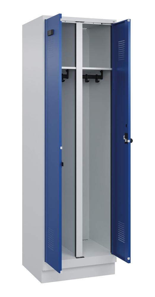 Garderobenschrank, paarw. zuein. schlagende Türen, BxTxH 600x500x1950 mm, 2 Abteile, 1 Nutzer, Abt.B 300 mm, Sockel, Drehriegel, Farbbwahl E6479091