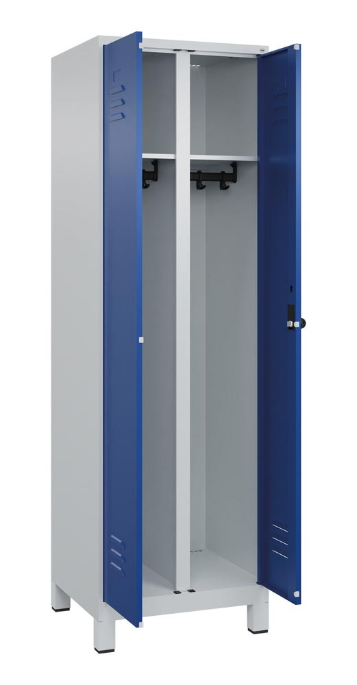 Garderobenschrank, paarw. zuein. schlagende Türen, BxTxH 600x500x1950 mm, 2 Abteile, Abt.B 300 mm, Füße, Drehriegel, Farbwahl E6476223