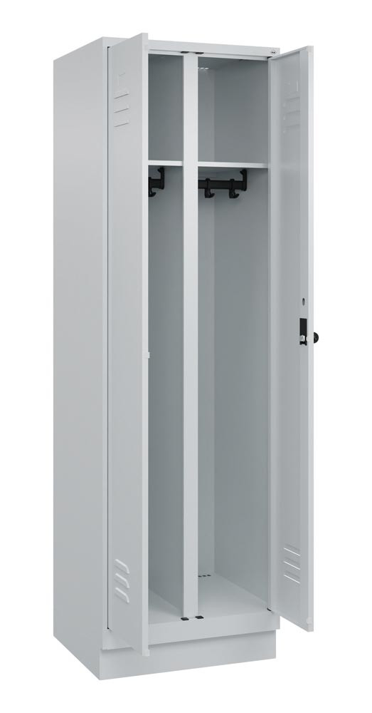Garderobenschrank, paarw. zuein. schlagende Türen, BxTxH 600x500x1950 mm, 2 Abteile, Abt.B 300 mm, Sockel, Drehriegel, RAL 7035 E6476230