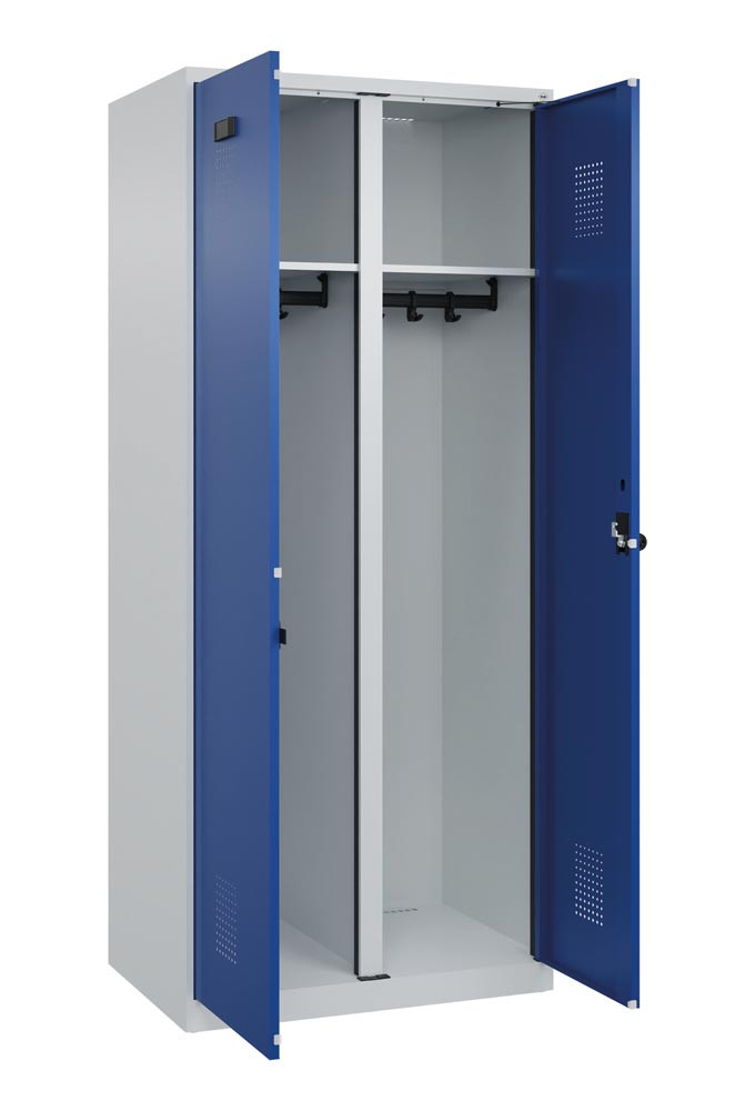 · Stabile Stahlkonstruktion mit hochwertiger Einbrennbeschichtung · Schmale Seitenkanten für verbesserte Optik bei Reihenstellung · Türen verstärkt, mit Anschlagdämpfer und Lüftungslochbild · Sicherheits-Drehriegelverschluss (serienmäßig) für Vorhangschloss (als Zubehör erhältlich) · Konstruktion aufbruchgeschützt gem. höchster Klasse C nach DIN 4547-2 · Abteilboden glatt auskehrbar · Verdrehsichere Doppel-Schiebehaken · Mit paarweise zueinanderschlagenden Türen und gemeinsamem Verschluss, 2 Abteile = 1 Person · Zur professionellen "Schwarz-/Weiß-Trennung" von Berufs- und Privatkleidung gem. Arbeitsstättenrichtlinie