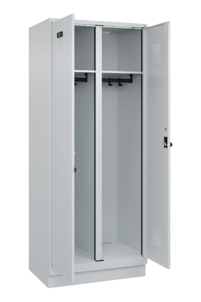 Garderobenschrank, paarw. zuein. schlagende Türen, BxTxH 600x500x1950 mm, 2 Abteile, 1 Nutzer, Abt.B 300 mm, Sockel, Drehriegel, Farbbwahl E6479091