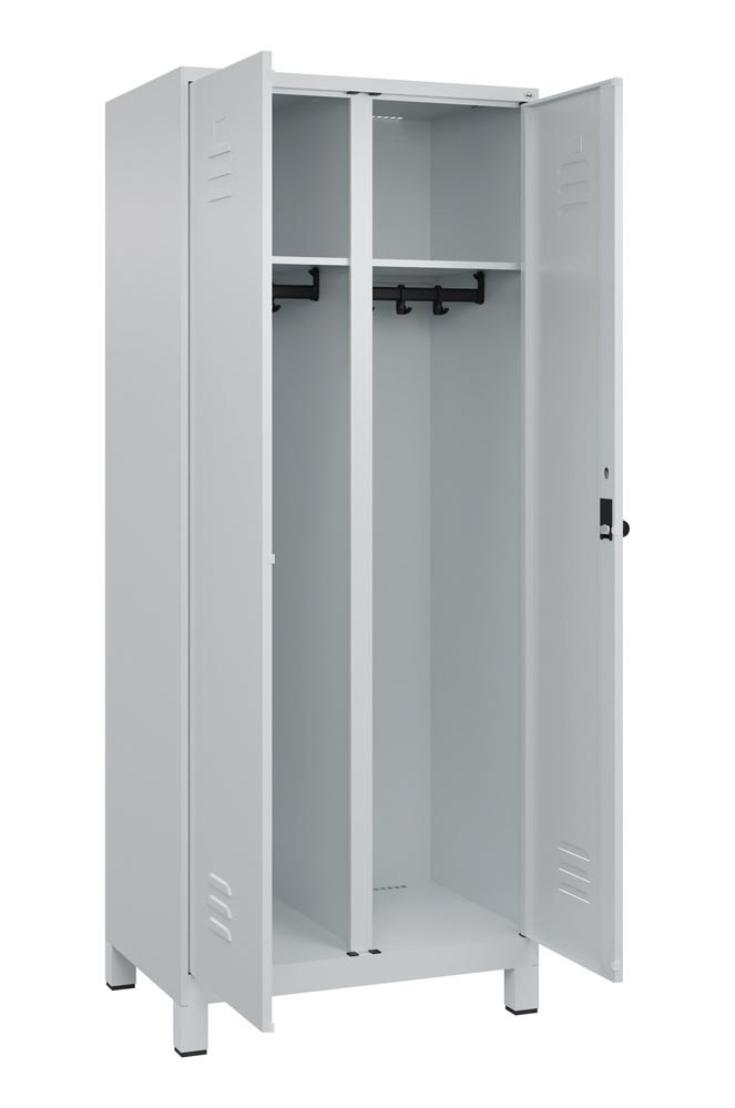 Garderobenschrank, paarw. zuein. schlagende Türen, BxTxH 600x500x1950 mm, 2 Abteile, Abt.B 300 mm, Füße, Drehriegel, Farbwahl E6476223