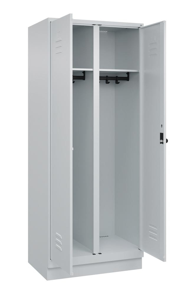 Garderobenschrank, paarw. zuein. schlagende Türen, BxTxH 800x500x1950 mm, 2 Abteile, Abt.B 400 mm, Sockel, Drehriegel, RAL 7035 E6476233