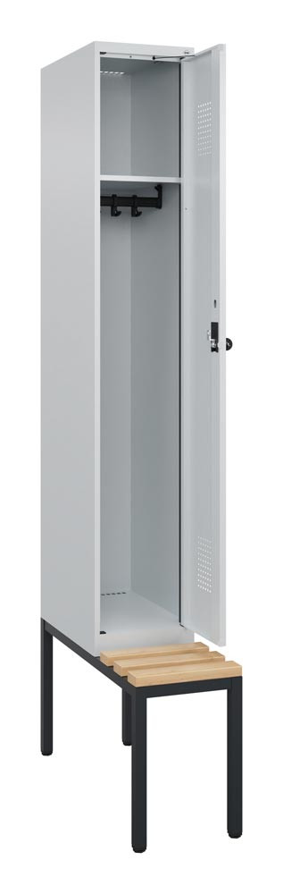 Garderobenschrank, untergeb. Sitzbank, Buche-Sitzleisten, 1 Abteil, Abt.B 300 mm, Drehriegel, BxTxH 300x500x2120 mm, RAL 7035 E6476591