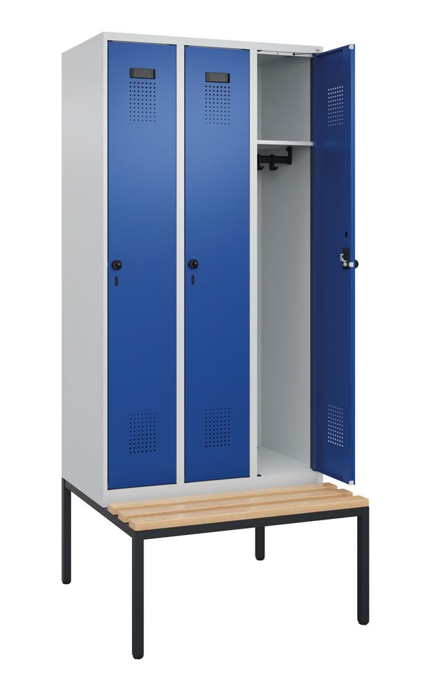 Garderobenschrank, untergeb. Sitzbank, Buche-Sitzleisten, 1 Abteil, Abt.B 300 mm, Drehriegel, BxTxH 300x500x2120 mm, RAL 7035/5010 E6476592