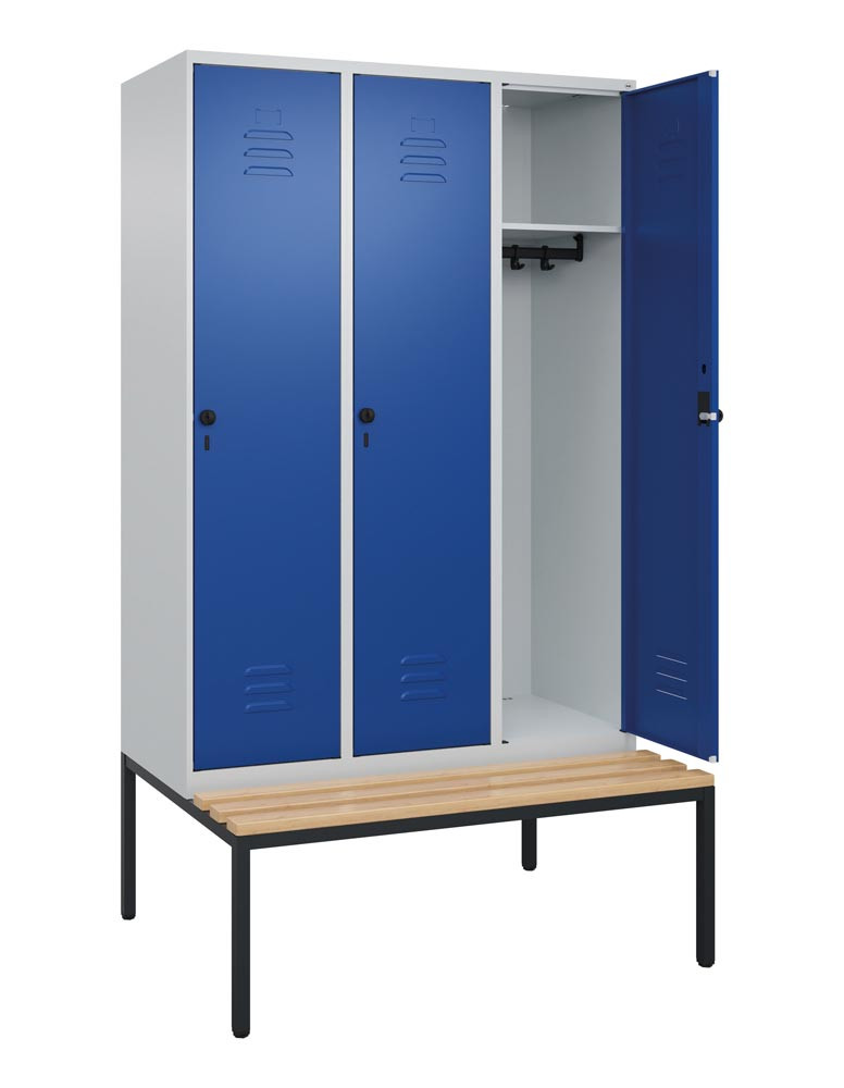 Garderobenschrank, untergeb. Sitzbank, BxTxH 1200x500x2120 mm, 3 Abteile, Abt.B 400 mm, Holzleisten, Drehriegel, RAL 7035/5010
