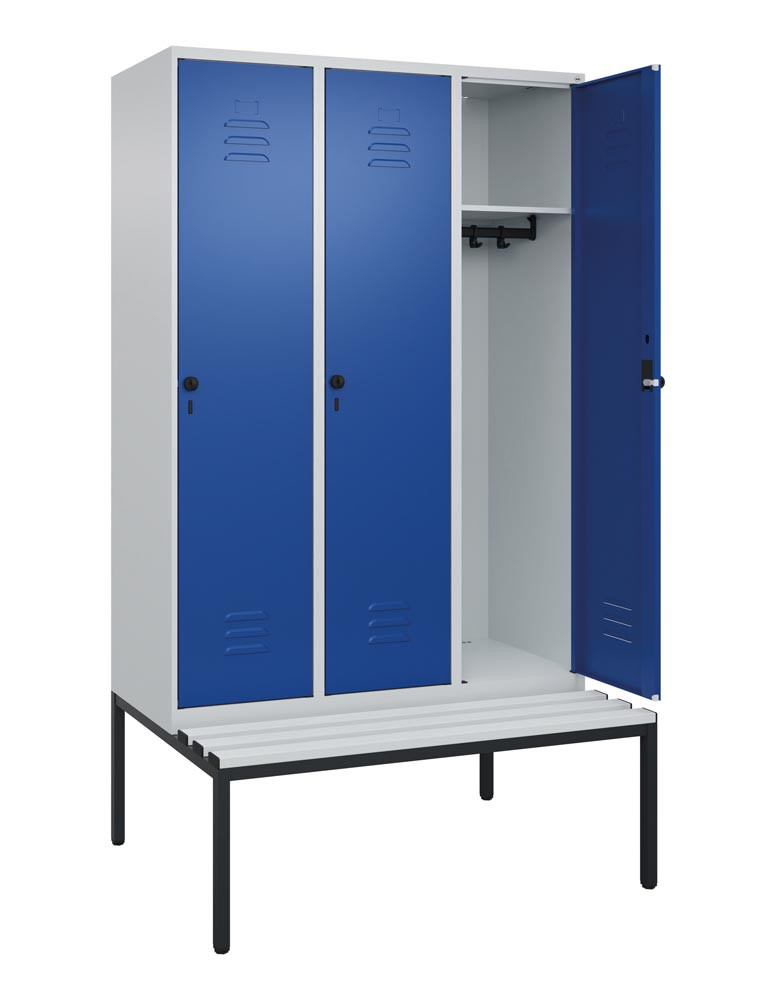 Garderobenschrank, untergeb. Sitzbank, BxTxH 1200x500x2120 mm, 3 Abteile, Abt.B 400 mm, Kunststoffleisten, Drehriegel, RAL 7035/5010