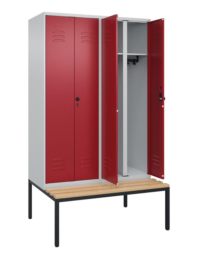 Garderobenschrank, untergeb. Sitzbank, BxTxH 800x500x2120 mm, 2 Abteile, Abt.B 400 mm, Holzleisten, Drehriegel, RAL 7035/5010 E6476243