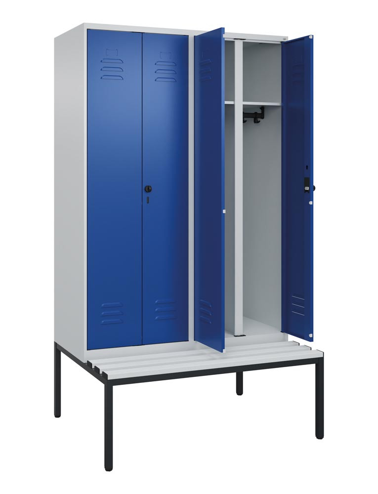Garderobenschrank, untergeb. Sitzbank, BxTxH 800x500x2120 mm, 2 Abteile, Abt.B 400 mm, Kunststoffleisten, Drehriegel, RAL 7035/5010 E6476252
