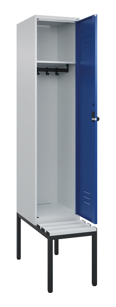 Garderobenschrank, untergeb. Sitzbank, BxTxH 300x500x2120 mm, 1 Abteil, Abt.B 300 mm, Kunststoffleisten, Drehriegel, RAL 7035/5010 E6476191